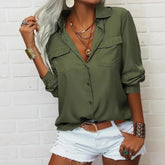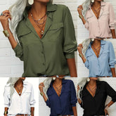 Women's Elegant Solid Chiffon Blouse Spring Summer Casual Long Sleeve V Neck Loose Shirt Office Lady Tunics Tops